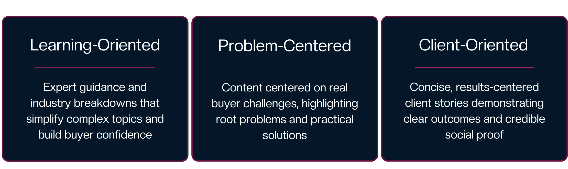 • Customer-Centric: Sharing stories of how clients solved problems (social proof).